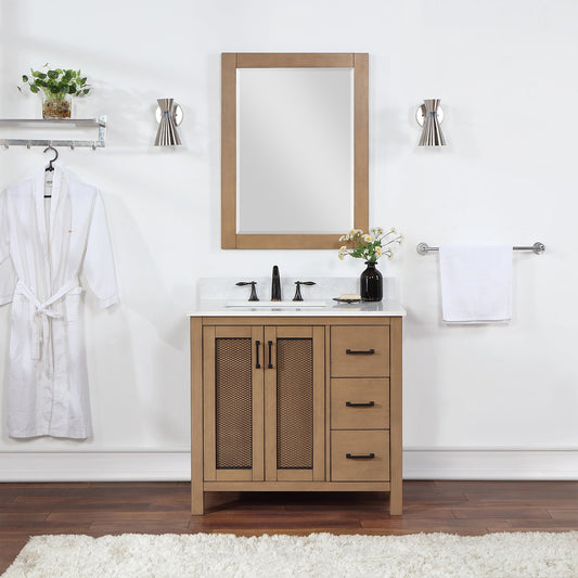 Hadiya 36" Single Bathroom Vanity Set in Brown Pine with Aosta White Engineered Stone Countertop with Mirror