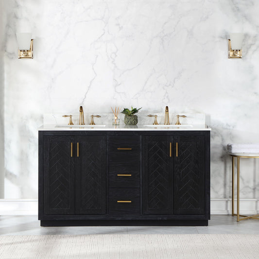 Gazsi 60" Double Bathroom Vanity Set in Black Oak with Grain White Engineered Stone Countertop without Mirror