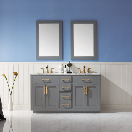 Ivy 60" Double Bathroom Vanity Set in Gray and Carrara White Marble Countertop with Mirror
