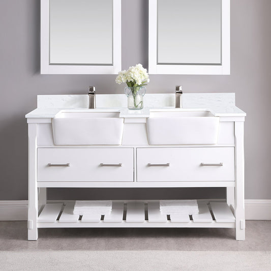 Georgia 60" Double Bathroom Vanity Set in White and Aosta White Composite Stone Top with White Farmhouse Basin without Mirror