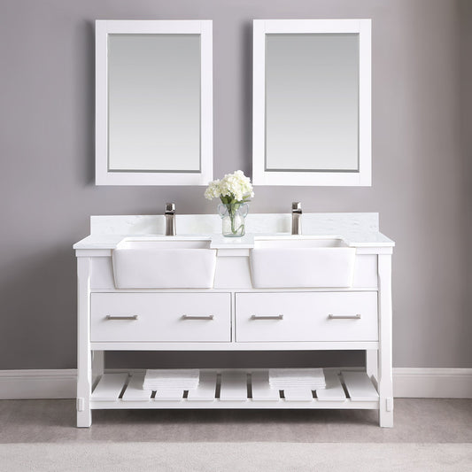Georgia 60" Double Bathroom Vanity Set in White and Aosta White Composite Stone Top with White Farmhouse Basin with Mirror