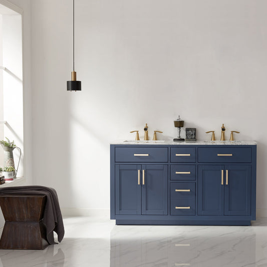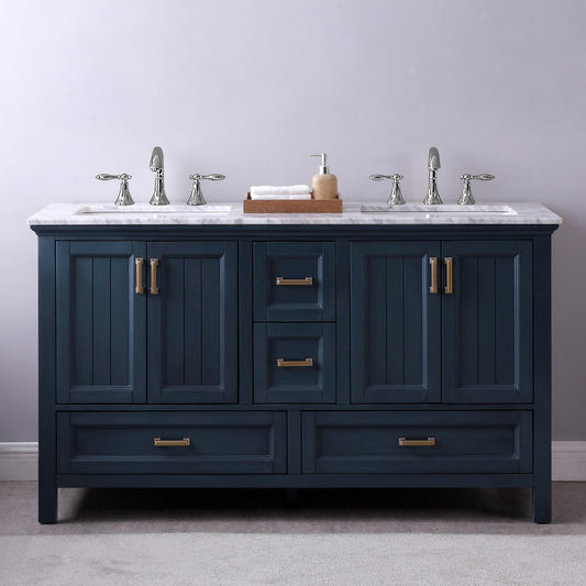 Ivy 60" Double Bathroom Vanity Set in Royal Blue and Carrara White Marble Countertop without Mirror