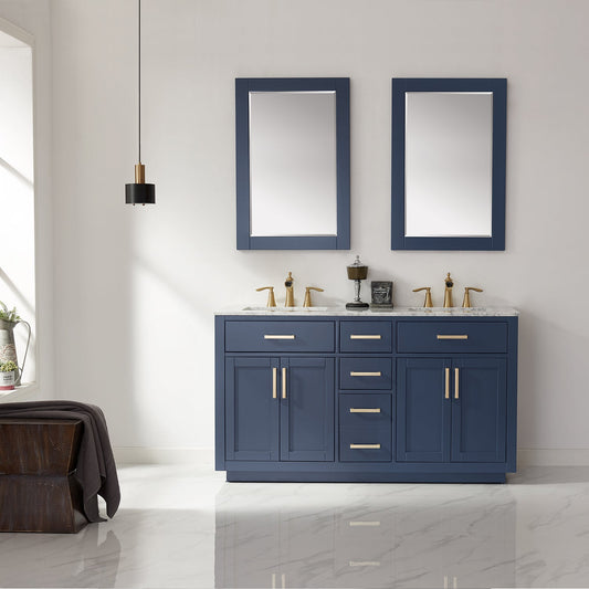 Ivy 60" Double Bathroom Vanity Set in Royal Blue and Carrara White Marble Countertop with Mirror