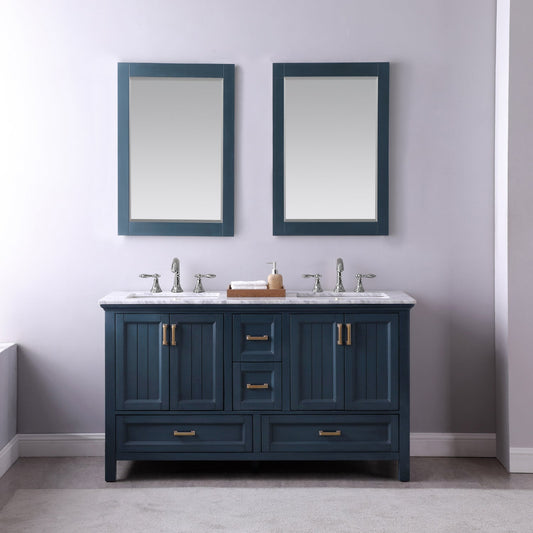 Isla 60" Double Bathroom Vanity Set in Classic Blue and Carrara White Marble Countertop with Mirror