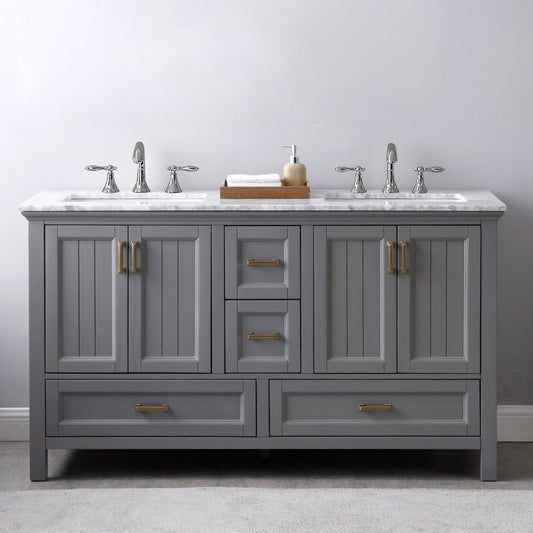Isla 60" Double Bathroom Vanity Set in Gray and Carrara White Marble Countertop without Mirror