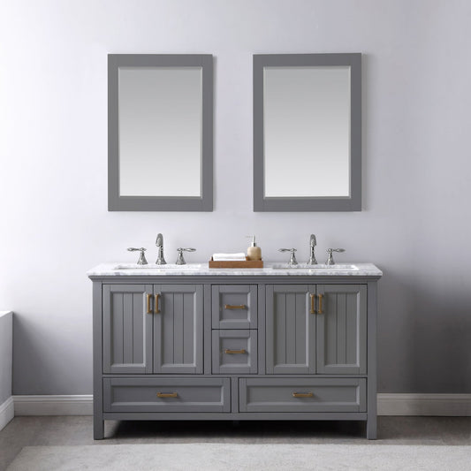 Isla 60" Double Bathroom Vanity Set in Gray and Carrara White Marble Countertop with Mirror