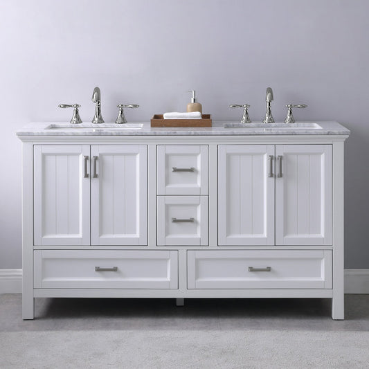 Isla 60" Double Bathroom Vanity Set in White and Carrara White Marble Countertop without Mirror