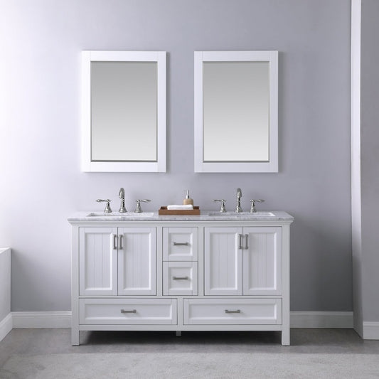 Isla 60" Double Bathroom Vanity Set in White and Carrara White Marble Countertop with Mirror