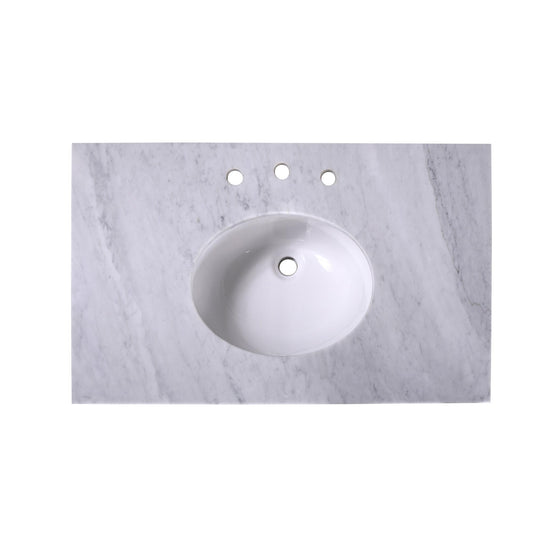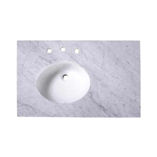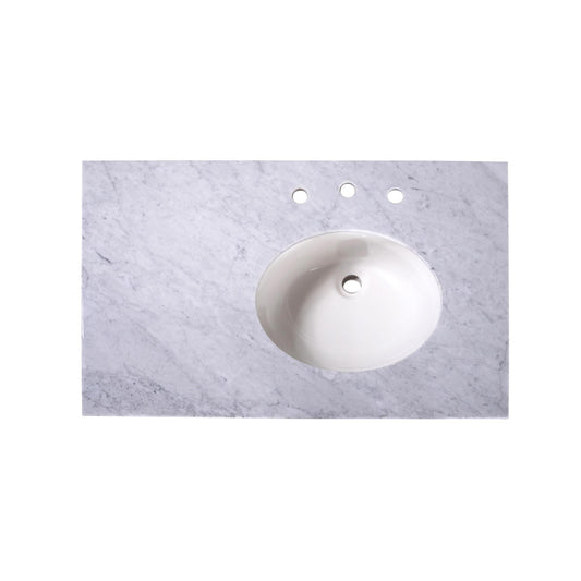 36" x 22" x 0.75" Carrara White Marble Top - 4" Backsplash, Single Oval Ceramic Sink (8" spread)