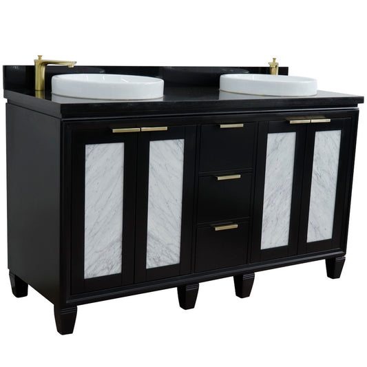 61" Double sink vanity in Black finish with Black galaxy granite and round sink
