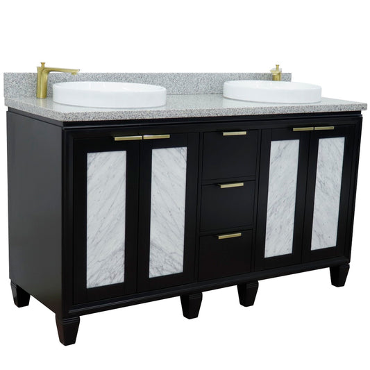 61" Double sink vanity in Black finish with Gray granite and round sink