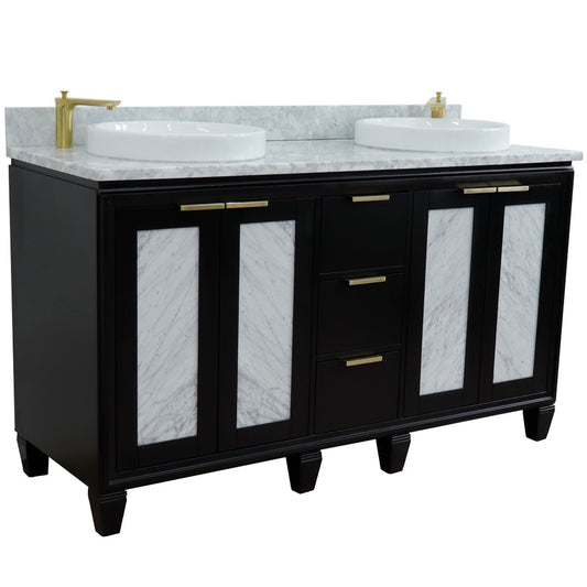 61" Double sink vanity in Black finish with White Carrara marble and round sink