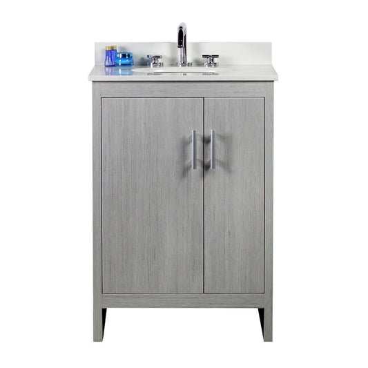 25" Single vanity in Gray Pine finish top with White engineered stone and oval sink