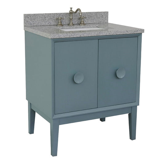 31" Single vanity in Aqua Blue finish with Gray granite top and rectangle sink