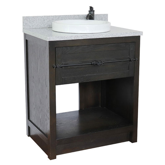 31" Single vanity in Brown Ash finish with Gray granite top and round sink