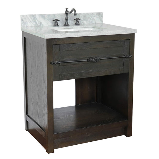 31" Single vanity in Brown Ash finish with White Carrara top and rectangle sink