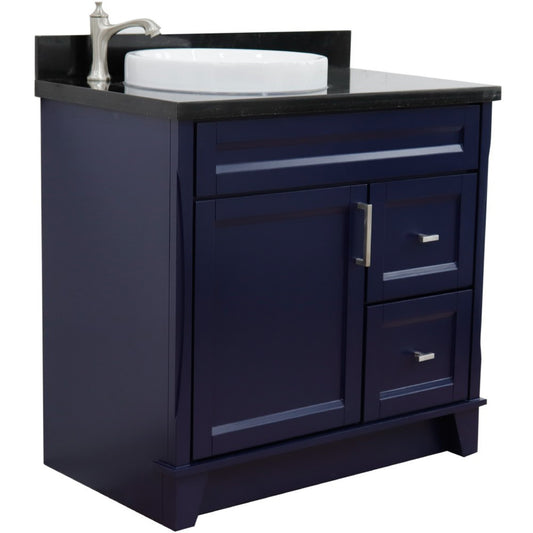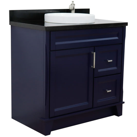 37" Single sink vanity in Blue finish with Black galaxy granite and Left door/Round Center sink