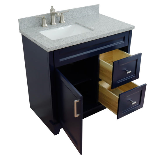 37" Single sink vanity in Blue finish with Gray granite and CENTER rectangle sink RIGHT drawers