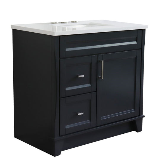 37" Single sink vanity in Dark Gray finish with White engineered stone and CENTER rectangle sink RIGHT drawers