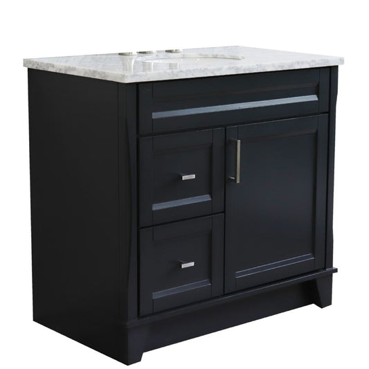 37" Single sink vanity in Dark Gray finish with White Carrara marble and LEFT oval sink RIGHT drawers