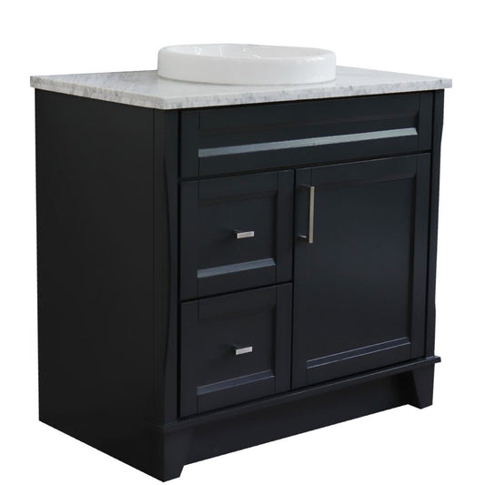 37" Single sink vanity in Dark Gray finish with White Carrara marble and LEFT round sink RIGHT drawers