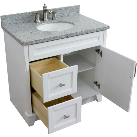 37" Single sink vanity in White finish with Gray granite and LEFT oval sink RIGHT drawers
