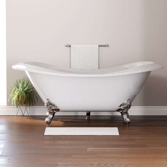 Extra Large Acrylic Double Slipper Clawfoot Tub, Polished Chrome Feet and Continuous Rim