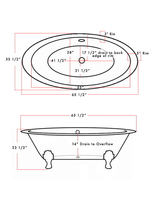Extra Wide Cast Iron Clawfoot Tub, 65.5 x 35.5 No Faucet Holes and Polished Chrome Feet