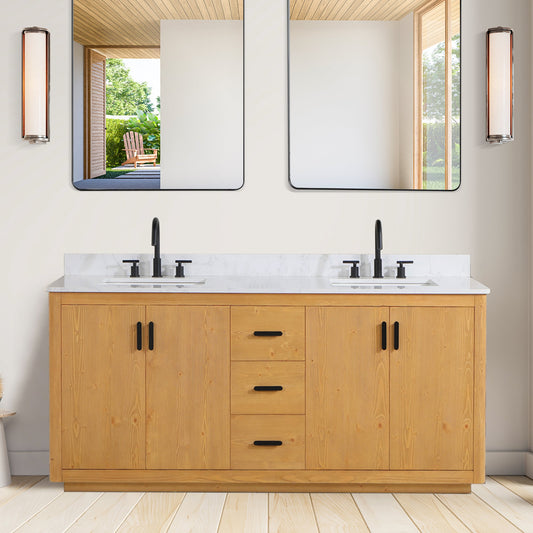 Perla 72" Double Bathroom Vanity in Natural Wood with Grain White Engineered Stone Countertop without Mirror