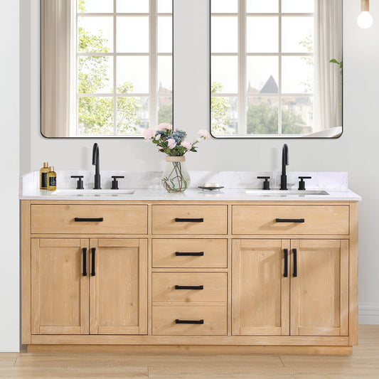 Gavino 72" Double Bathroom Vanity in Light Brown with Grain White Engineered Stone Countertop without Mirror
