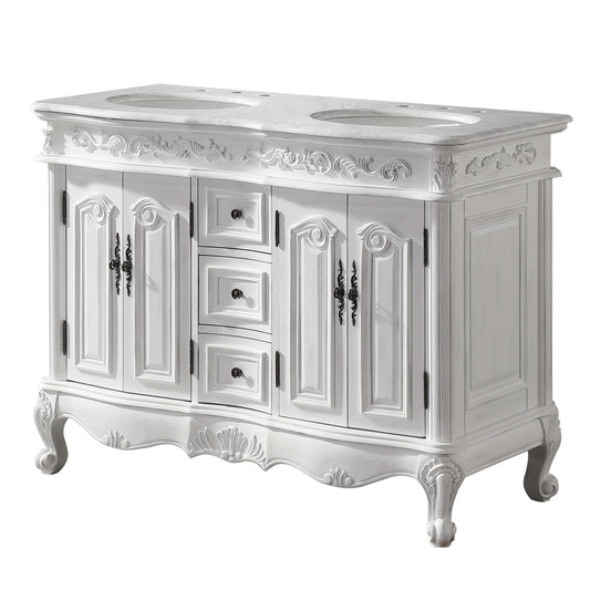 48" Double Sink Cabinet - Carrara White Top, Undermount White Ceramic Sinks (3-hole)