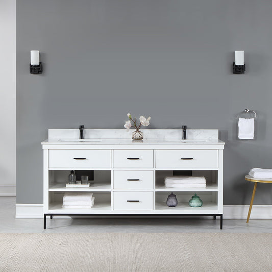 Kesia 72" Double Bathroom Vanity Set in White with Aosta White Engineered Stone Countertop without Mirror