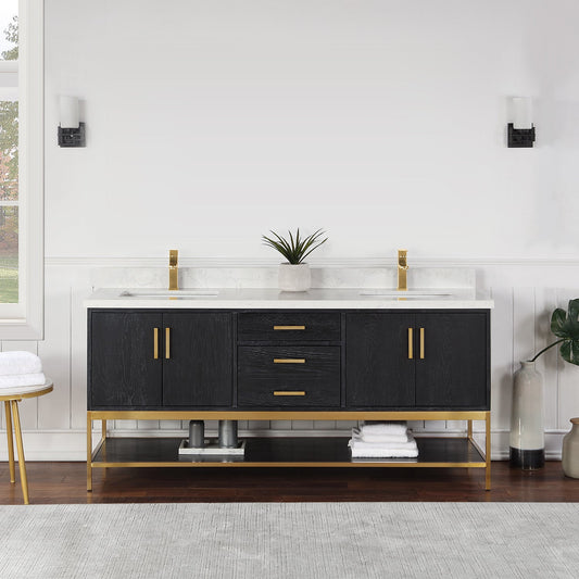 Wildy 72" Double Bathroom Vanity Set in Black Oak with Grain White Engineered Stone Countertop without Mirror