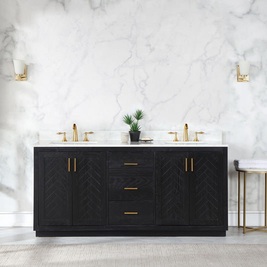 Gazsi 72" Double Bathroom Vanity Set in Black Oak with Grain White Engineered Stone Countertop without Mirror