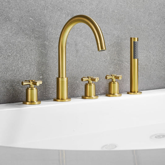 Sorlia Cross Handles Deck-Mount Roman Tub Faucet in Brushed Gold with Handshower