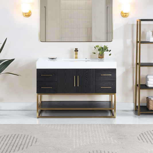 Bianco 48D" Single Bathroom Vanity in Black Oak with Brushed Gold Support Base and White Engineered Stone Countertop without Mirror