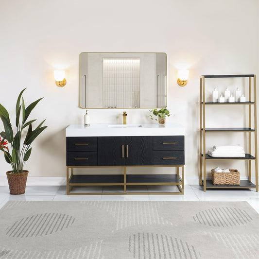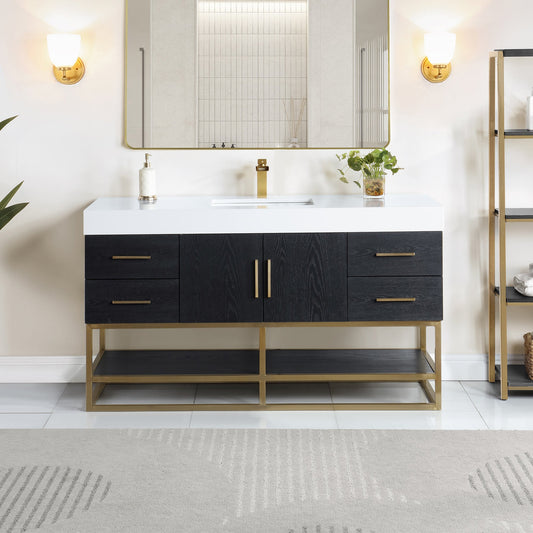 Bianco 60" Single Bathroom Vanity in Black Oak with Brushed Gold Support Base and White Engineered Stone Countertop without Mirror