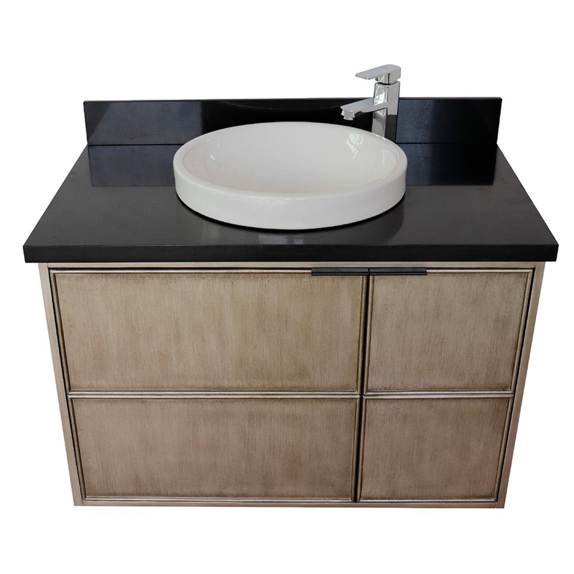 37" Single wall mount vanity in Linen Brown finish with Black Galaxy top and round sink