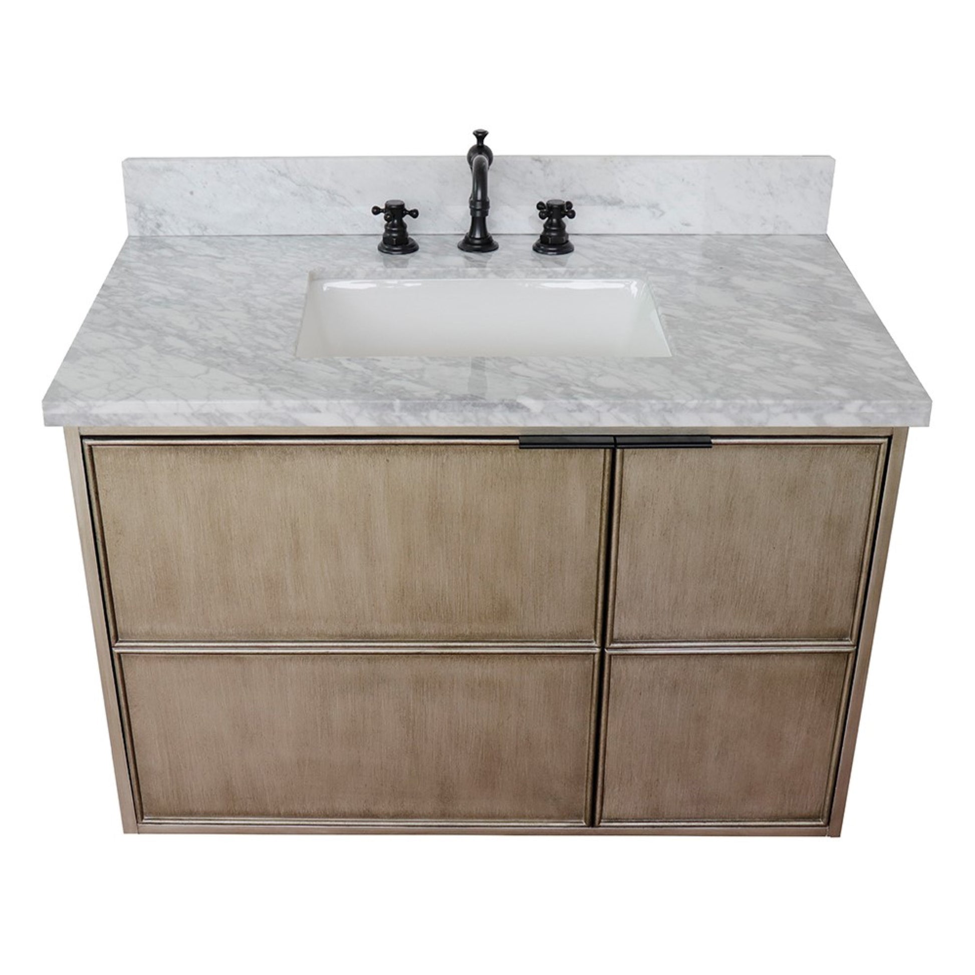 37" Single wall mount vanity in Linen Brown finish with White Carrara top and rectangle sink