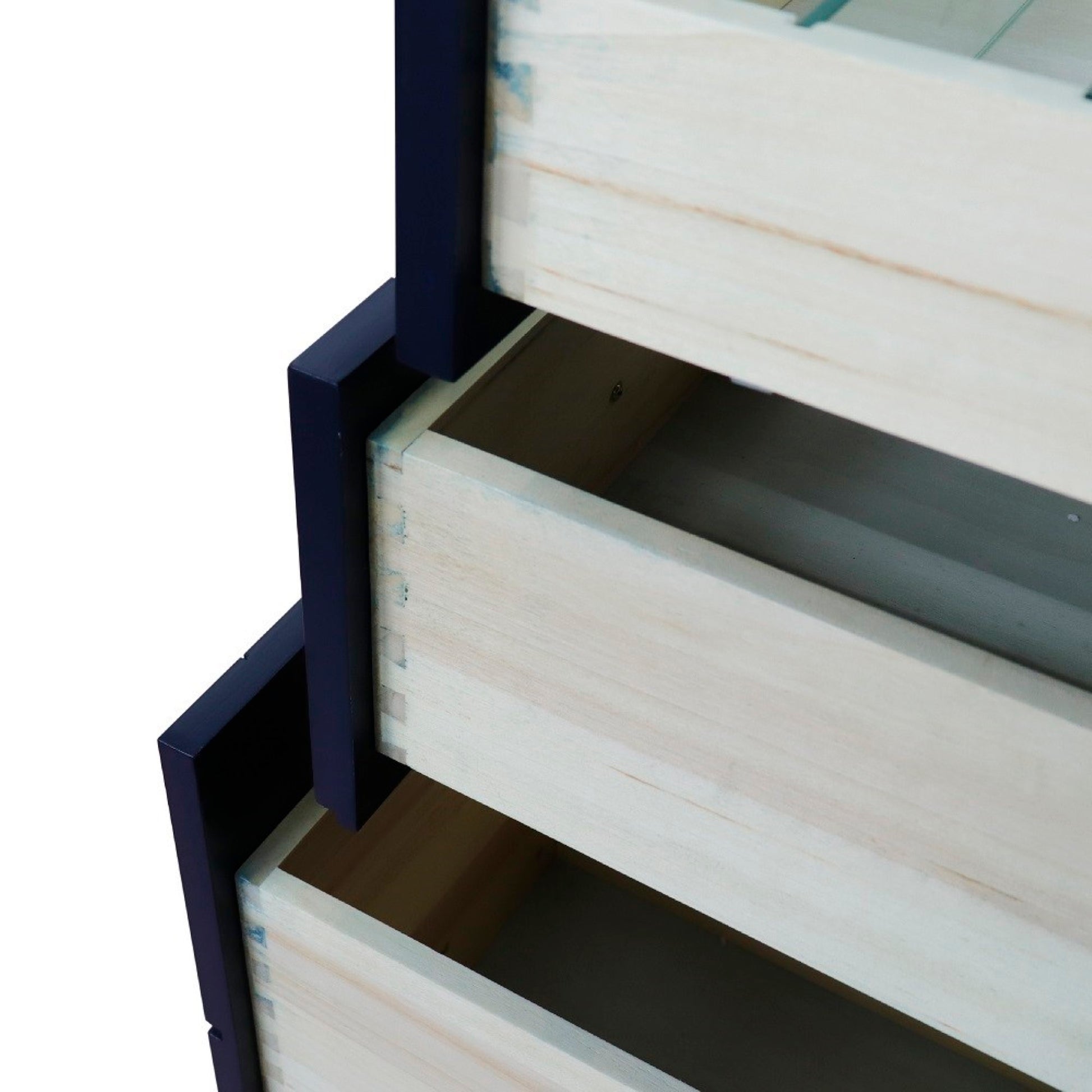 The Terni collection by Bellaterra Home features simple style bathroom vanities that can integrate seamlessly with any home design. From a simple or to the grand home design, you will appreciate this beautifully crafted piece of furniture as the focal point in your bathroom. The structure of the cabinet is built with solid oak. This vanity has six drawers and two cabinet doors that open to a large ample storage space. The drawers are constructed with English dovetail and are installed with smooth full extension glides to provide durability. This vanity features brushed nickel finish hardware and a beautiful counter top that is pre-sealed and polished for added protection. The bathroom vanity top is preinstalled with a white cUPC certified ceramic sink.