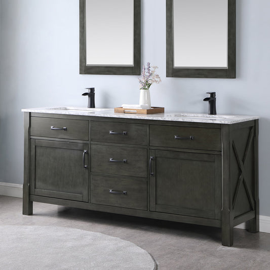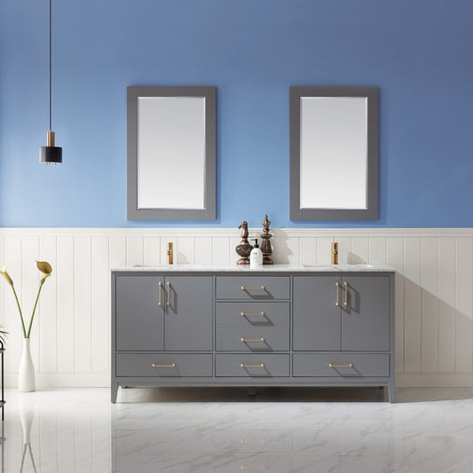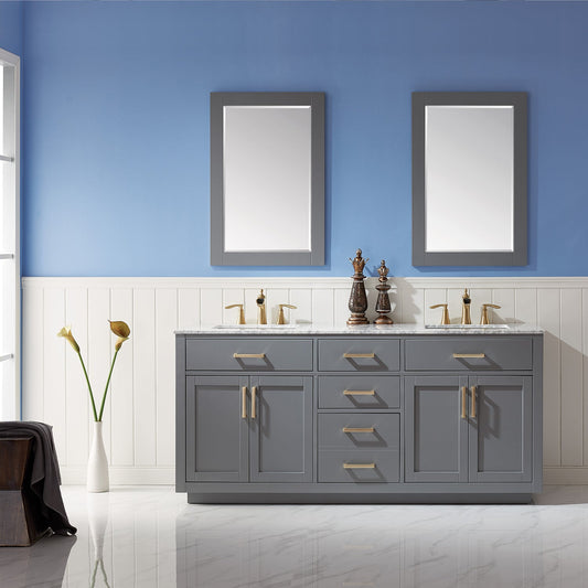 Ivy 72" Double Bathroom Vanity Set in Gray and Carrara White Marble Countertop with Mirror