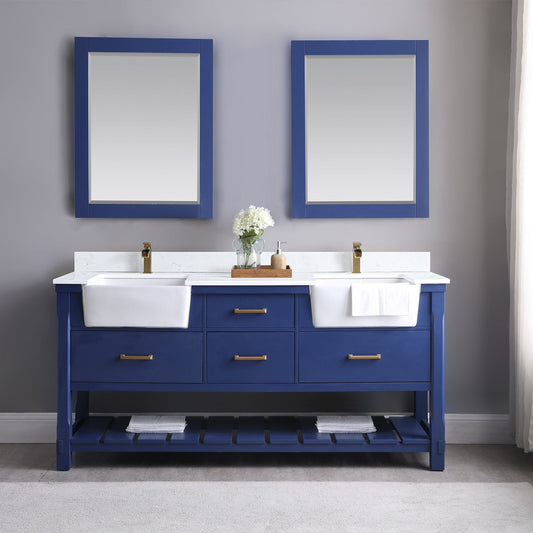 Georgia 72" Double Bathroom Vanity Set in Jewelry Blue and Aosta White Composite Stone Top with White Farmhouse Basin with Mirror