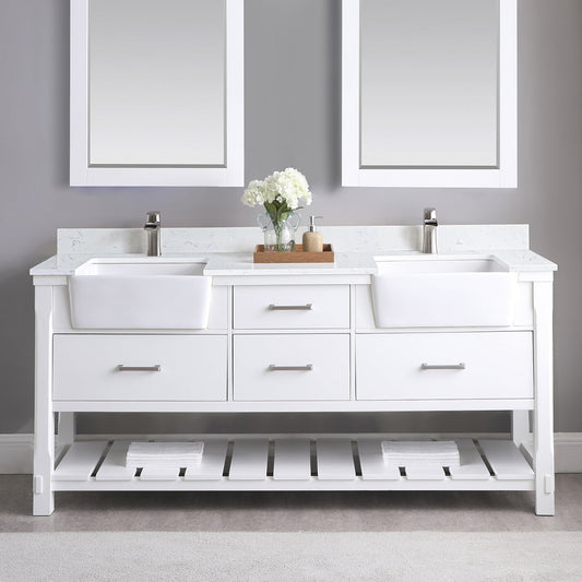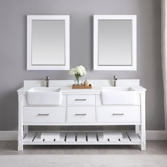 Georgia 72" Double Bathroom Vanity Set in White and Aosta White Composite Stone Top with White Farmhouse Basin with Mirror