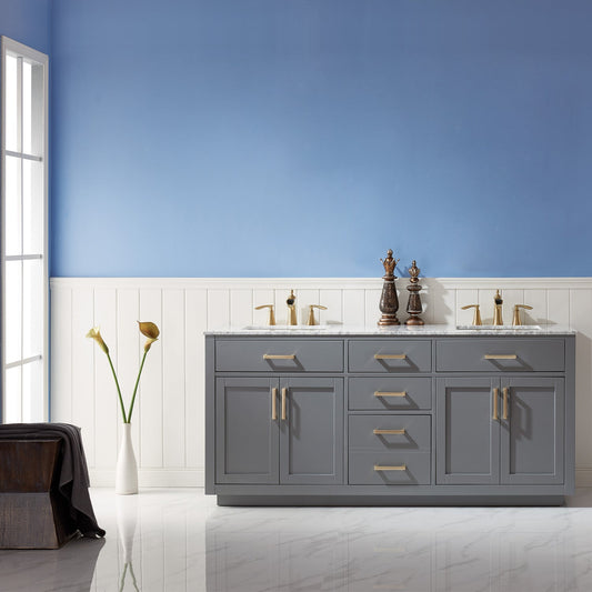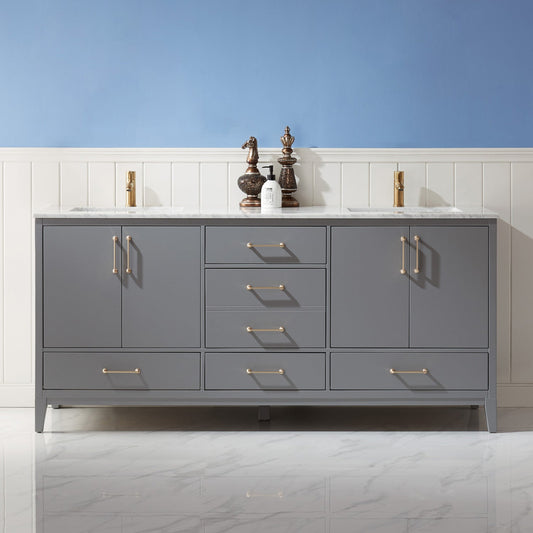 Ivy 72" Double Bathroom Vanity Set in Gray and Carrara White Marble Countertop without Mirror