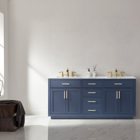 Ivy 72" Double Bathroom Vanity Set in Royal Blue and Carrara White Marble Countertop without Mirror