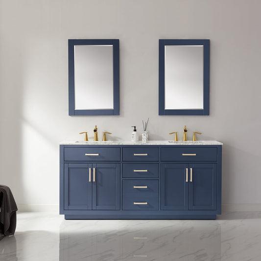 Ivy 72" Double Bathroom Vanity Set in Royal Blue and Carrara White Marble Countertop with Mirror