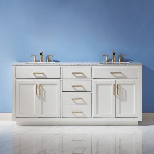 Ivy 72" Double Bathroom Vanity Set in White and Carrara White Marble Countertop without Mirror