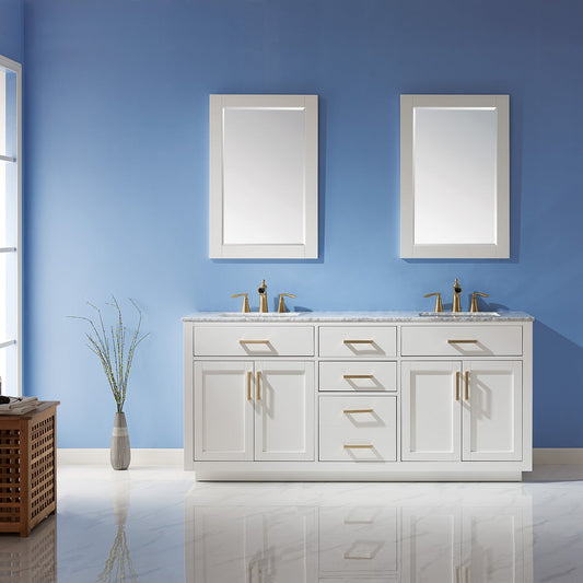 Ivy 72" Double Bathroom Vanity Set in White and Carrara White Marble Countertop with Mirror