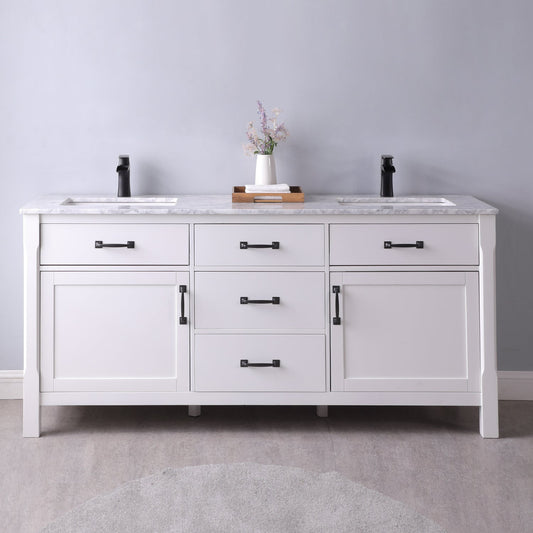 Maribella 72" Double Bathroom Vanity Set in White and Carrara White Marble Countertop without Mirror