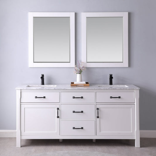 Maribella 72" Double Bathroom Vanity Set in White and Carrara White Marble Countertop with Mirror